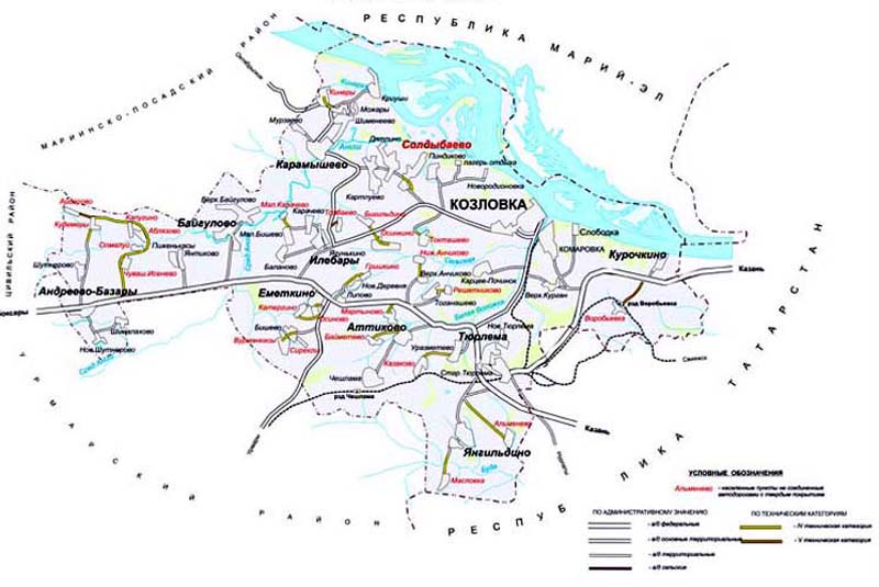 Есть на территории Чувашии уникальные места, которые можно охарактеризовать не только как присущие данной местности, но отнести ко всей территории Российской Федерации. На берегу Волги вместе, где проходит и соединяется три границы рядом находящиеся регионов, расположен город Козловка, который также является административным центром одноименного района. Отсюда до столицы Чувашии Чебоксары почти 100 километров по автомобильной дороге, чуть меньше расстояние по реке Волге, в Козловке есть паромная переправа через реку Волга, в летний период времени навигации здесь работает пассажирская пристань. В окрестностях Козловки имеется большое количество ископаемых природных материалов, извести, глины и доломита которые используется в качестве строительных материалов.